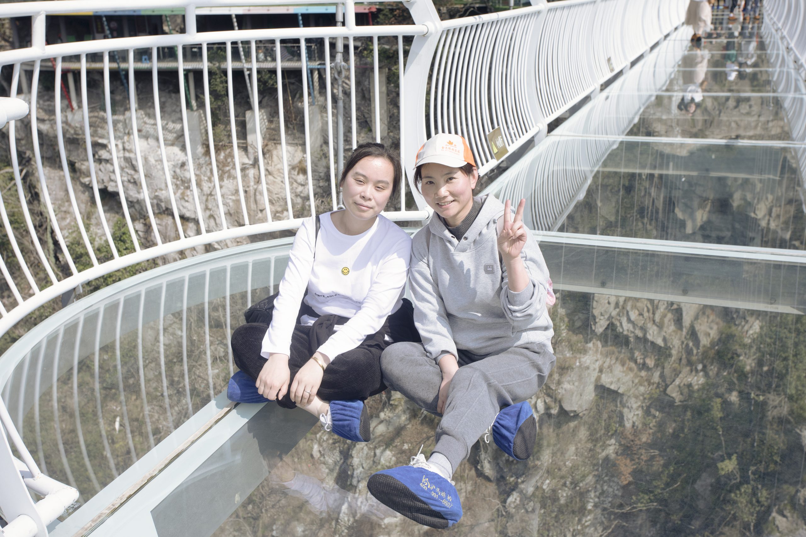 ? ? ? 到了半山腰,大家又體驗(yàn)了一把飛天魔毯,它全長310米,是懶人爬山神器,坐上傳送帶,大家可以輕松登頂,而且還能欣賞兩邊的風(fēng)景。下了飛天魔毯就到了梁皇山景區(qū)的核心區(qū)——全長318米的連云渡玻璃棧橋。玻璃橋宛若銀龍橫跨山崖,真是人在橋上走,云在身邊飄,走在橋上還能感覺到橫風(fēng)帶來的輕微的顫動(dòng)。雖然踩在上面是有驚無險(xiǎn),不少小姐姐還是揪著心,不敢往下看,牽著同事的手趕緊走過去;當(dāng)然,也有些膽大的不停地拍攝合影,留戀不肯離開。