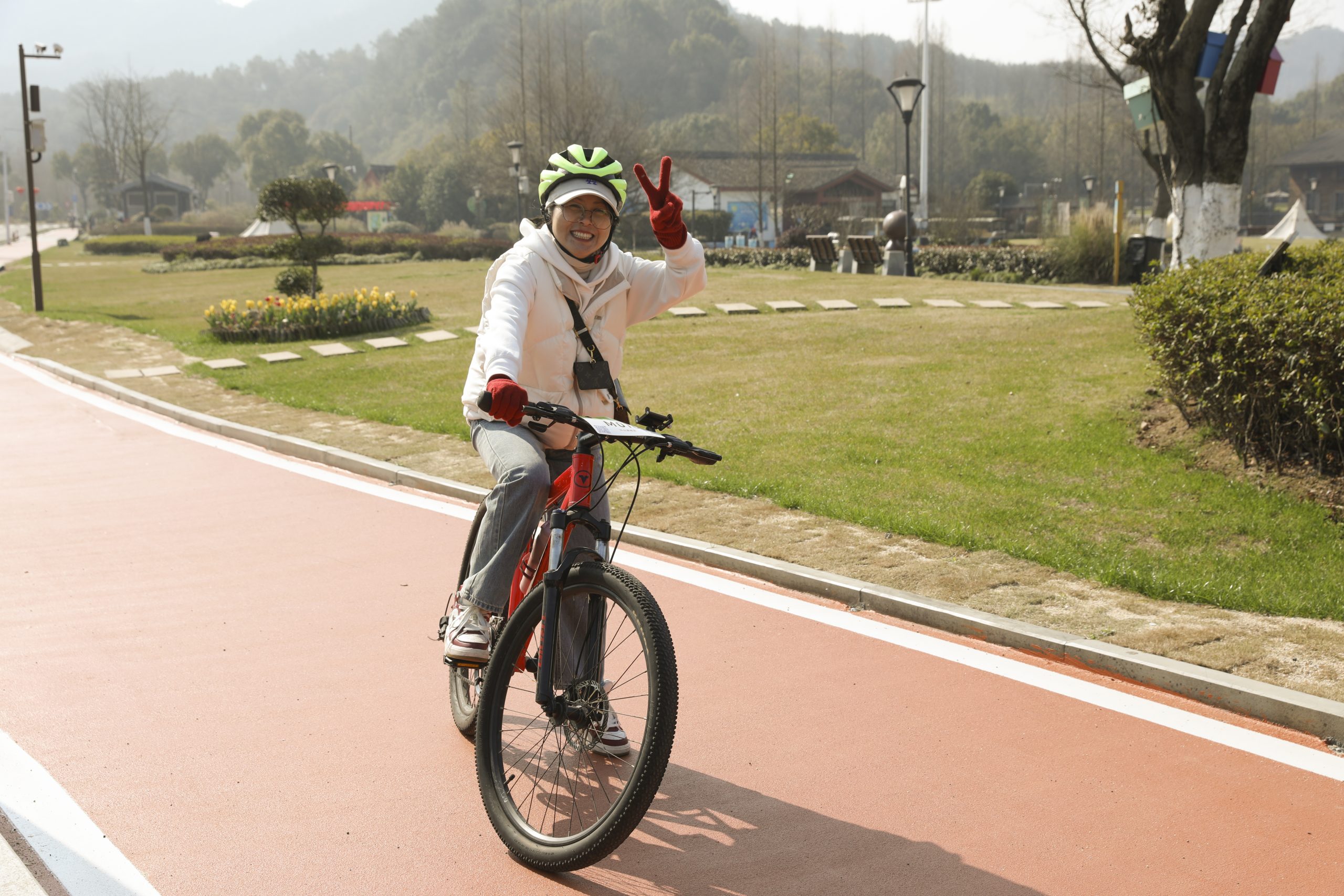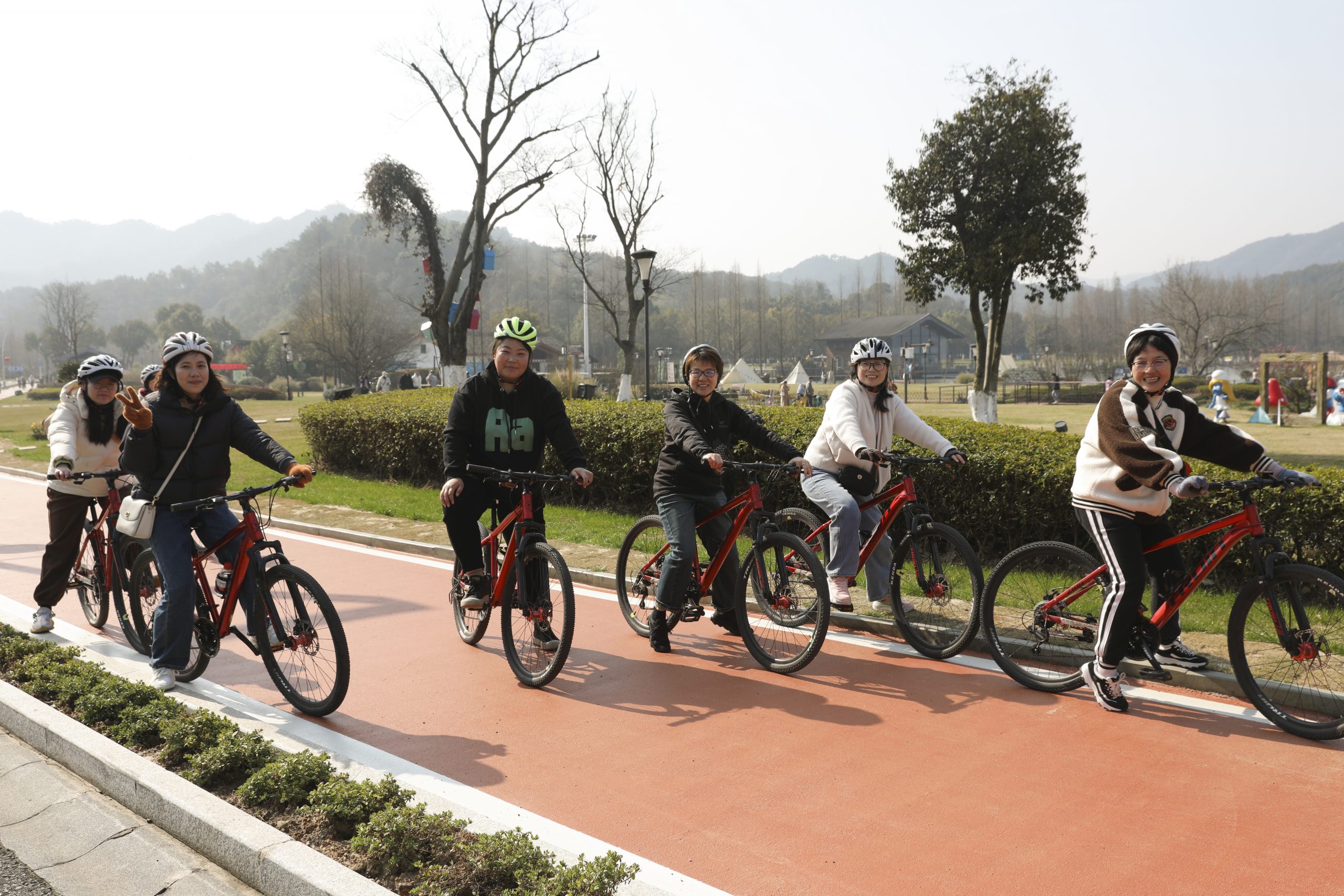 ? ? ? ?活動當(dāng)天陽光明媚,東錢湖風(fēng)光旖旎,湖光山色連成景,人在景中,景在畫中。早上9點(diǎn),女職工們在馬山濕地騎行驛站集合,帶上騎行頭盔,聽教練講解后依次出發(fā)。